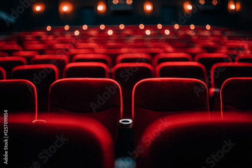 © Nadezhda, Obraz premium Rows of red seats in a theater with a black background