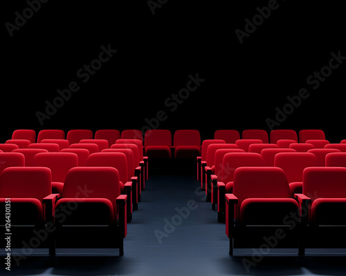 © Nadiyah, Fototapeta premium Rows of red seats in empty movie theater or stage, dark background, event promo generative AI