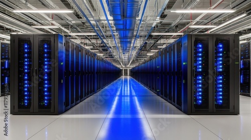 Fototapeta premium Rows of servers in a modern data center with blue lights.