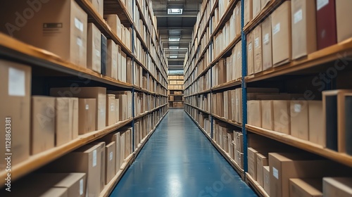 Fototapeta premium Rows of storage shelves with precise labels copy space inventory efficiency...