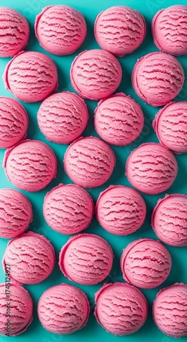© MOHAMMOD, Obraz premium Rows of strawberry ice cream scoops on a bright turquoise background