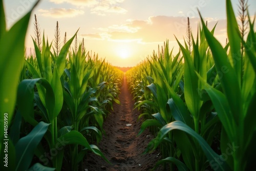 Fototapeta premium Rows of tall corn stalks gleam under morning sun, creating a lush green vista , peaceful, morning, maize