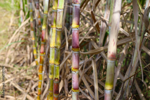 © Bowonpat, Fototapeta premium Rows of tall sugarcane with purple stalks and long green leaves.