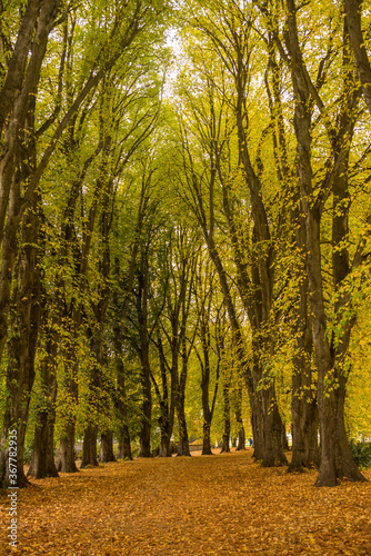 Obraz premium Rows of trees in Wanaka Station Park in full autumn glory