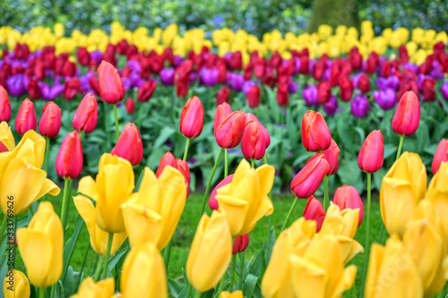 © Jbyard, Fototapeta premium Rows of tulips and other flowers in a garden in the Netherlands.