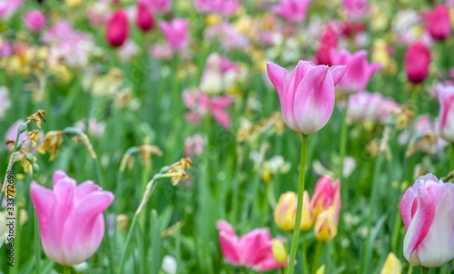 Fototapeta premium Rows of tulips and other flowers in a garden in the Netherlands.