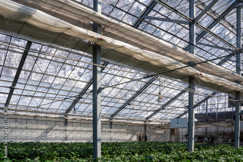 Obraz premium Rows of vibrant strawberry plants thrive inside a modern greenhouse with a...
