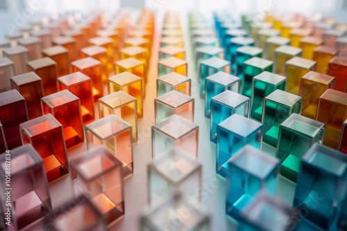 Obraz premium Rows of vibrant, translucent blocks reflect light, creating a visually...
