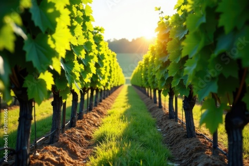 © Prasert, Naklejka premium rows of vines with sunlight filtering through leaves, rustic, foliage