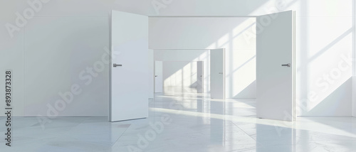 Obraz premium Rows of white open doors invite exploration of bright, spacious rooms...