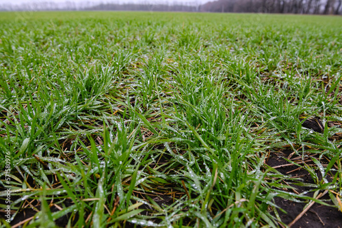 Fototapeta premium Rows of winter wheat shoots with raindrops, cloudy day.