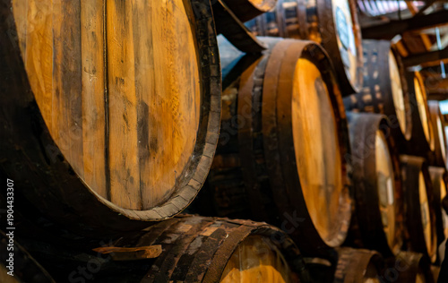 Naklejka premium Rows of wooden oak barrels in a wine cellar.
