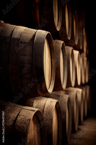 Naklejka premium Rows of wooden sherry barrels bask in soft light, creating a warm and inviting atmosphere Generative AI