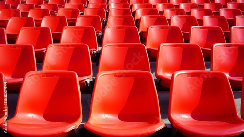 © Panuwat, Naklejka premium Rows red plastic chairs arranged neat orderly manner Several
