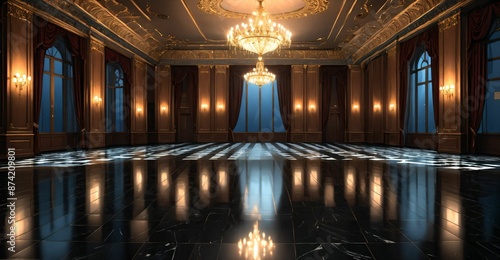 © Shane Sparrow, Fototapeta premium royal ballroom palace castle room interior. open mansion hall with pattern on smooth stone flooring. adorned in luxurious noble black and gold palette with intricate detail and warm lighting.