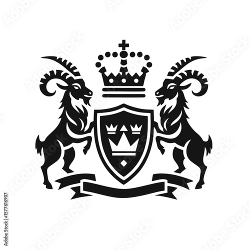 © JimzStd, Fototapeta premium royal crest goat holding shield and crown, isolated on white background