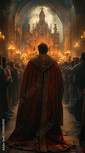 Naklejka premium Royal Figure in a Red Cloak Inside a Grand Cathedral
