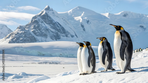 © TawhidulIslam, Fototapeta premium Royal King Penguins in Antarctic Snow with Majestic Mountains - Polar Wildlife & Winter Landscape