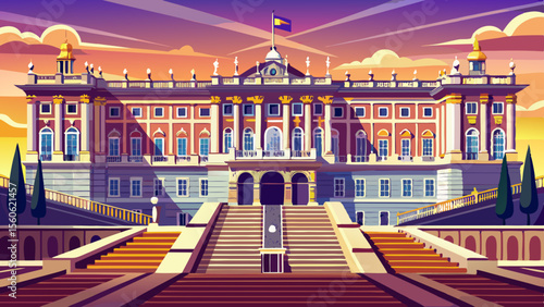 Naklejka premium Royal Palace of Madrid shines with granite and white stone symmetry, wide staircases, and regal balconies, standing as the ceremonial heart of Spain’s monarchy.