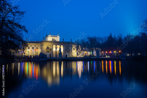 Naklejka premium Royal Palace on the Water in Lazienki Park at night in Warsaw, Poland