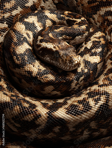 © Promsiri, Fototapeta premium Royal python coiled in spiral, close up showing detailed scales and natural brown, black, and cream pattern, calm and relaxed expression, reptile texture