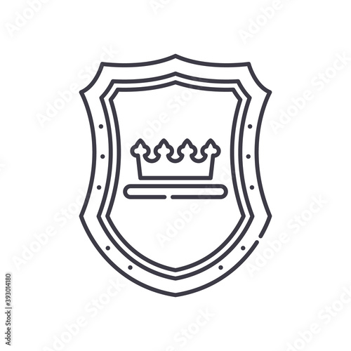 © Nina, Obraz premium Royal shield icon, linear isolated illustration, thin line vector, web design sign, outline concept symbol with editable stroke on white background.