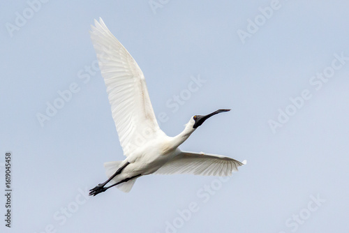 Fototapeta premium Royal Spoonbill in Mid-Flight Against Pale Sky