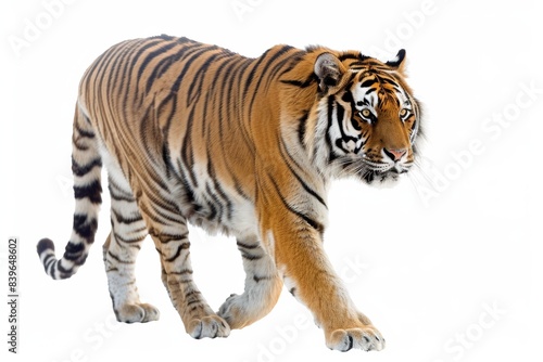 Fototapeta premium Royal tiger isolated on white background. The tiger is staring at its prey....