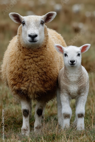 © Breezze, Fototapeta premium Royal Welsh Show Sheep and Lamb in Authentic Autumn Meadow Setting with Harvest Festival Joy for Premium Family Marketing and Agricultural Education