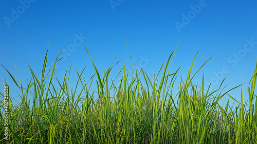 © Sawyer0, Fototapeta premium Rozległa łąka pokryta świeżą, zieloną trawą rozciąga się pod błękitnym, bezchmurnym niebem.