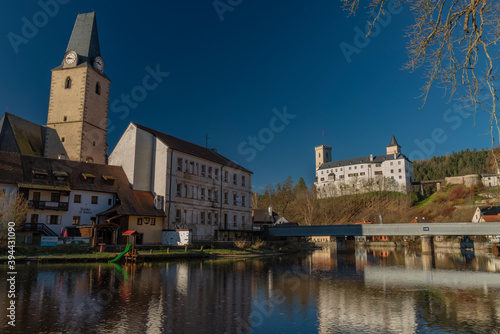 Naklejka premium Rozmberk nad Vltavou town with old castle over valley of river Vltava