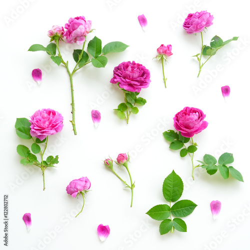© galina_d, Obraz premium Różne różowe róże głowy na białym tle. Róże i liście rozrzucone na stole, tapeta z widokiem z góry. Widok płaski kwiatów świeckich, widok z góry.