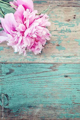 Fototapeta premium Różowa piwonia na starym grunge malować deski.