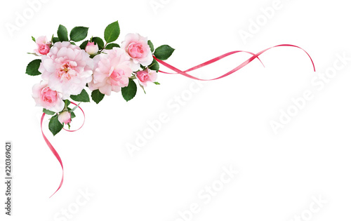 Fototapeta premium Różowe kwiaty i jedwabne falowane wstążki w narożnym układzie