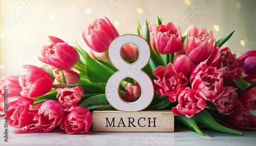 © Monika, Fototapeta premium Różowe tło z tulipanami i datą na dzień kobiet