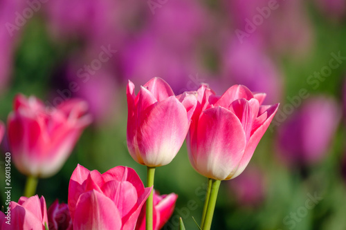 Naklejka premium Różowe tulipany na polu, zbliżenie.