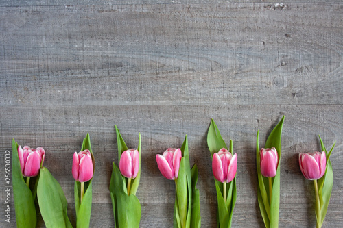 © Monika, Naklejka premium Różowe tulipany na szarym tle