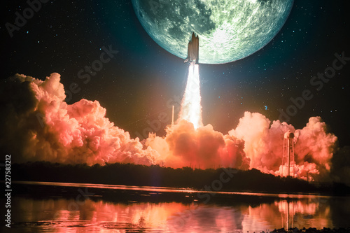 © elen31, Obraz premium Rozświetlając nocne niebo, a także pobliską wodę, statek kosmiczny lśni na księżycu. Ogromny księżyc znajduje się na nocnym niebie otaczającym galaktykę. Elementy tego zdjęcia dostarczone przez NASA.