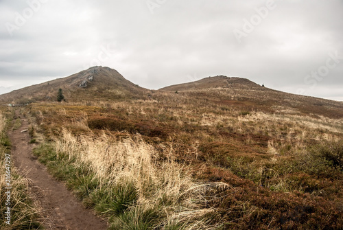 Fototapeta premium Rozsypaniec and Halicz hills with mountain meadows and rocks in autumn...