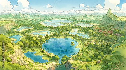 © umeno, Fototapeta premium 美しいゲーム内マップ風の背景イラスト|RPG・アドベンチャー・異世界ファンタジー・冒険・魔法・神殿・秘境・動画演出に最適