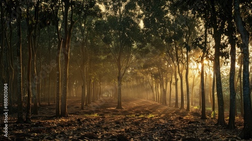 © Emin, Naklejka premium Rubber Tree Farm in Rural Area at Sunset with Text Space