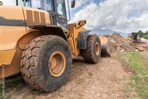 © Bulent, Obraz premium Rubber wheel loader yellow excavator. Heavy-duty machine for earth and road repairs.