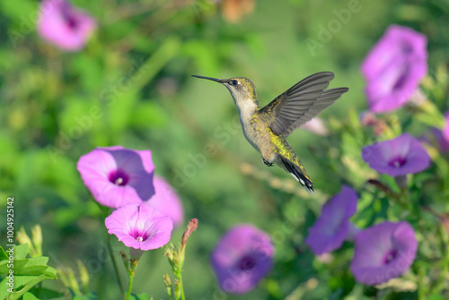 Naklejka premium Ruby-throated hummingbird (Archilochus colubris) hovering near the tievine morning glory flower (Ipomoea cordatotriloba) during migration, Texas, USA