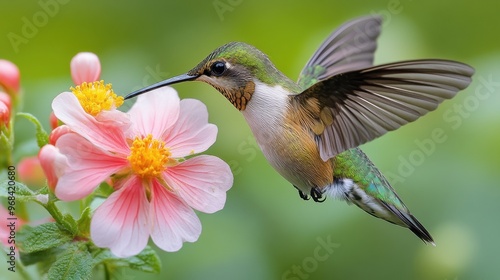 Naklejka premium Ruby-throated hummingbird feeding from a flower on a white background
