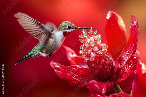 © john, Fototapeta premium Ruby throated hummingbird hovering and drinking nectar from red flower