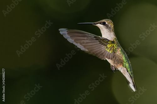 © rck, Fototapeta premium Ruby Throated Hummingbird Hovering in Flight Deep in the Green Forest