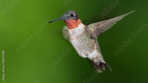© rck, Fototapeta premium Ruby Throated Hummingbird Hovering in the Green Forest