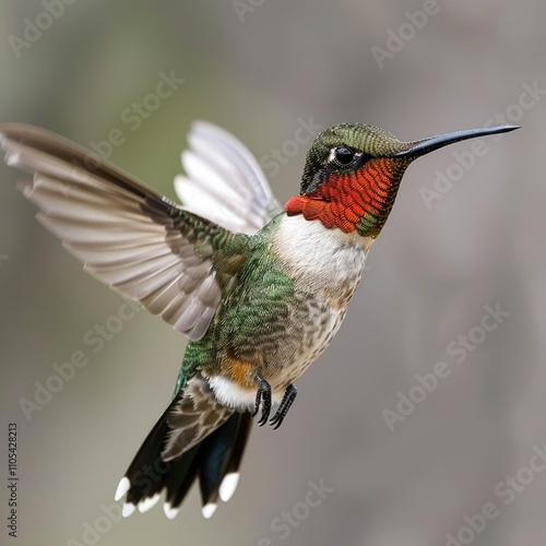© Imagehub, Fototapeta premium Ruby throated Hummingbird hovering looking at the viewer; isolated on white