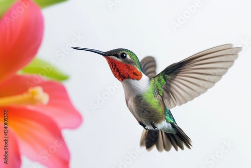 Fototapeta premium Ruby-throated Hummingbird Hovering Near Tropical Flower in Sharp Detail, Brilliant Iridescent Feathers Catching Sunlight