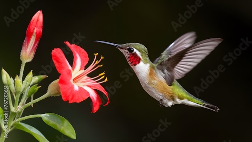 © Muhammad Ishaq, Naklejka premium Ruby throated hummingbird in flight near flower on dark background